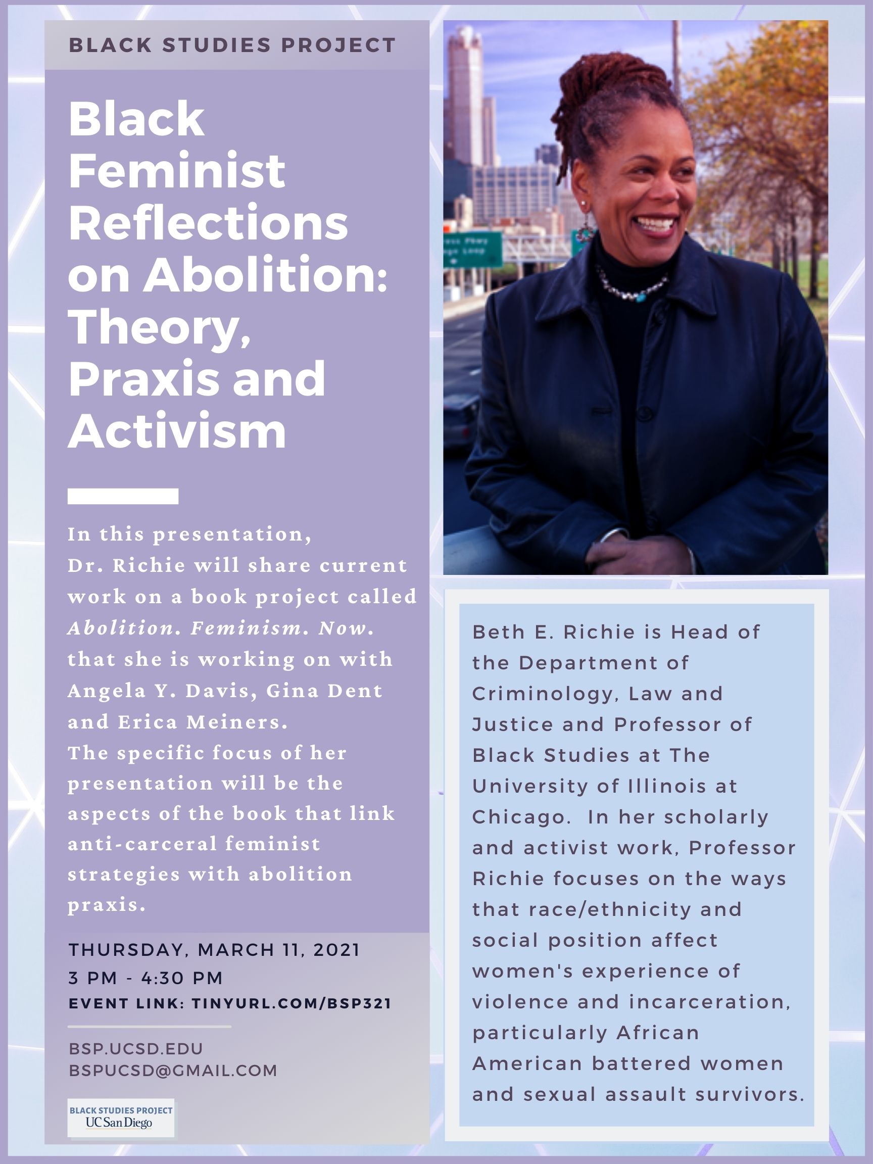 In this presentation, Dr. Ritchie will share current work on a book project called Abolition. Feminism. Now. that she is working on with Angela Y Davis, Gina Dent and Erica Seiners. The specific focus of her presentation will be the aspects of the book that link anti-carceral feminist strategies with abolition praxis.