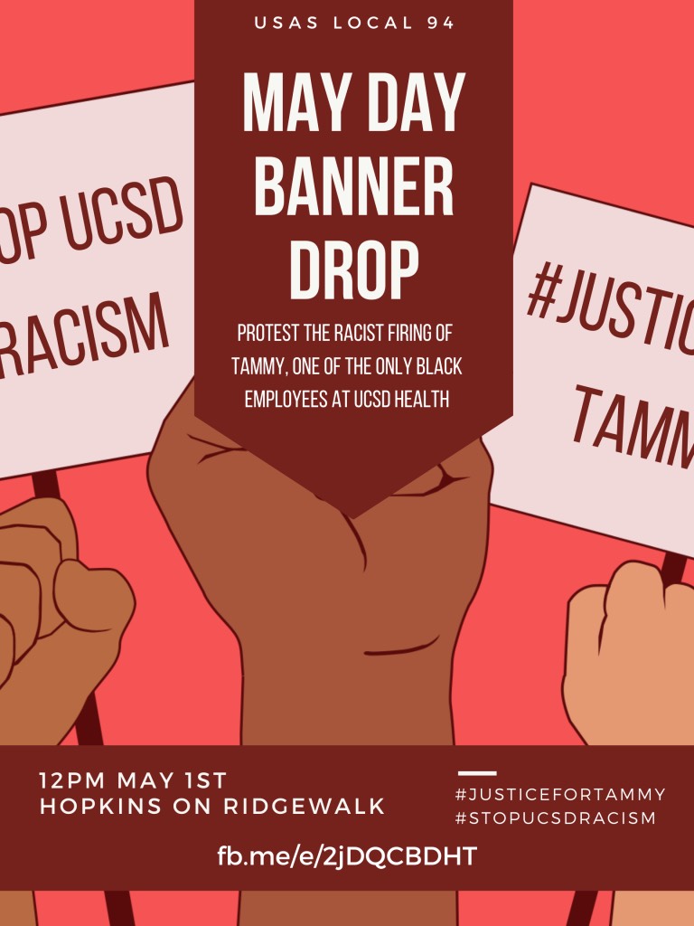 Protest the racist firing of Tammy, one of the only black employees at UCSD Health. NOON on May 1, Hopkins of Ridgewalk https://www.facebook.com/events/130145092428017/ event_date Sat, 05/01/2021 - 12:00 event_image