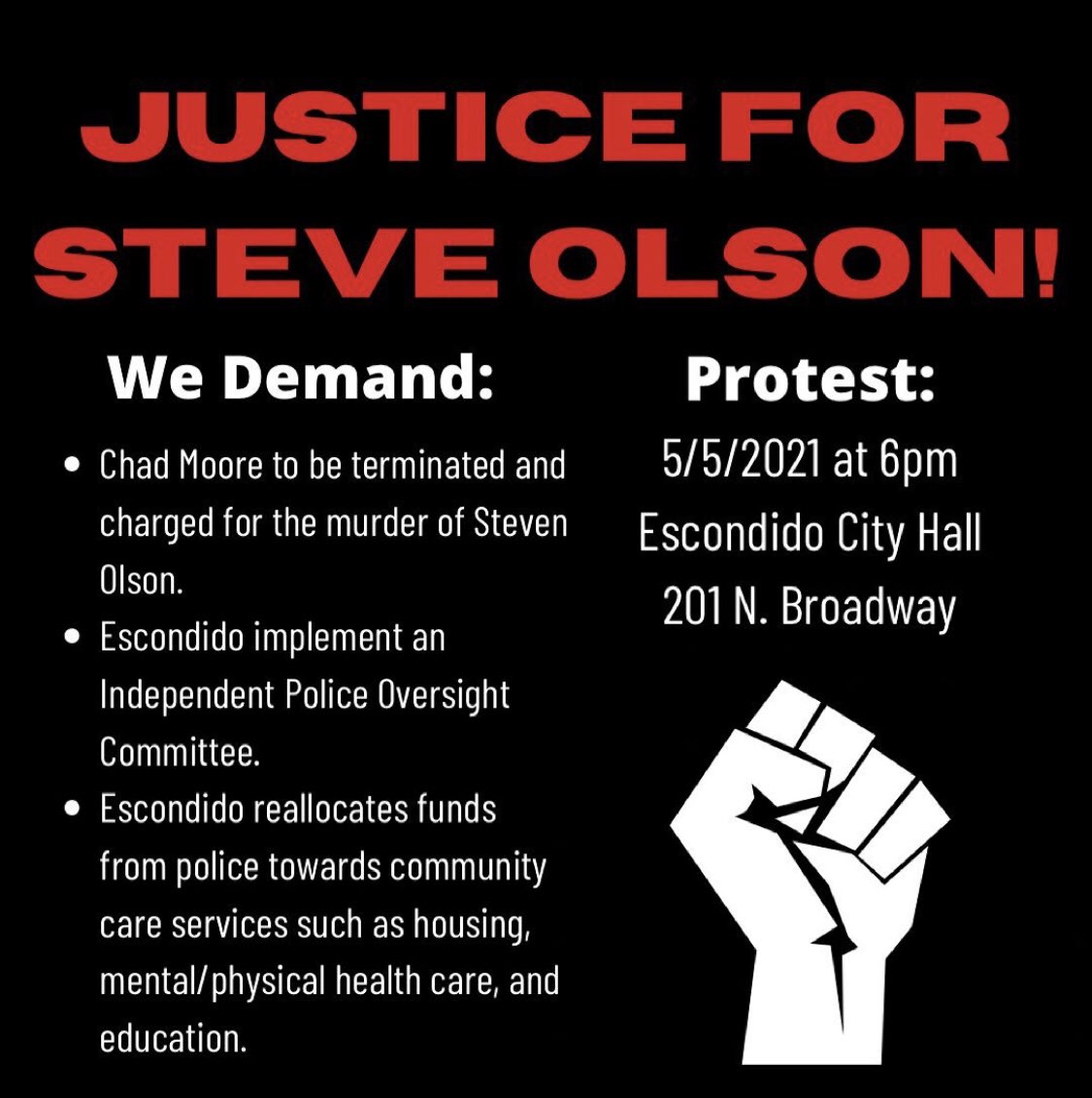 Protest: May 5, 2021 6PM Escondido City Hall 201 N. Broadway