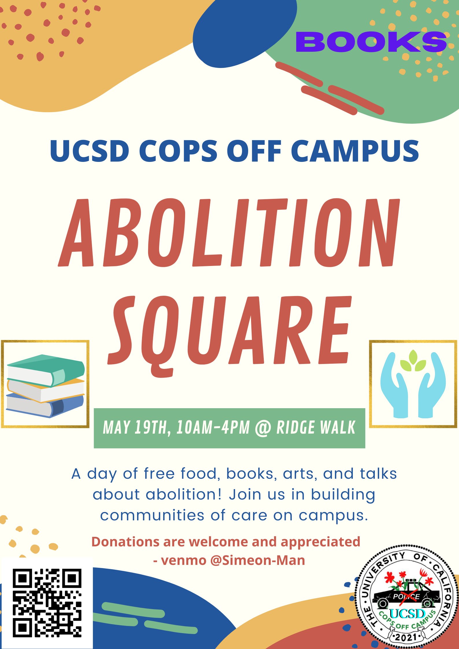 UCSD Cops off Campus: Abolition Square May 19, 10AM-4PM @ Ridge Walk near Social Sciences Building A day of free food, books, arts and talks about abolition Join us in building communities of care on campus event_date Wed, 05/19/2021 - 10:00 event_image