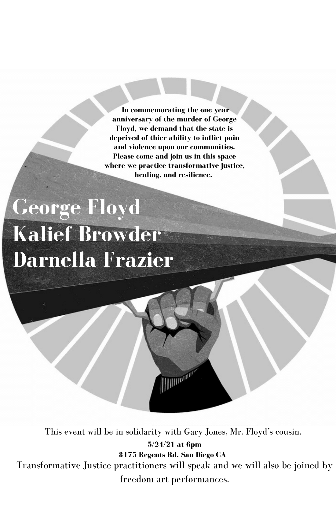 Commemoration event to mark the one year anniversary of George Floyd's murder, acknowledge victims of police brutality, and honor brave witnesses. The event will have music, art and some speakers who will discuss transformative justice. It will start at 6 pm tonight at Doyle Community Park, which is close to campus.